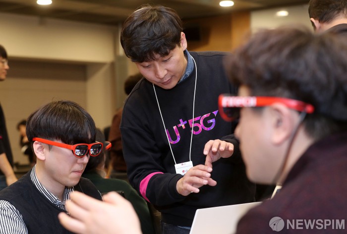 [서울=뉴스핌] 정일구 기자 = 11일 오전 서울 중구 대한상공회의소에서 열린 LG유플러스 AR글래스 체험 행사에서 취재진들이 AR글래스를 체험하고 있다. 2019.11.21 mironj19@newspim.com