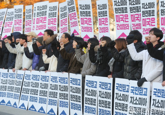 [서울=뉴스핌] 윤창빈 기자 = 22일 오전 서울 종로구 광화문광장에서 아베규탄 시민행동 회원들이 ‘지소미아 완전종료까지! 광화문광장 100인 피켓팅’을 개최하고 피켓을 들고 있다. 2019.11.22 pangbin@newspim.com