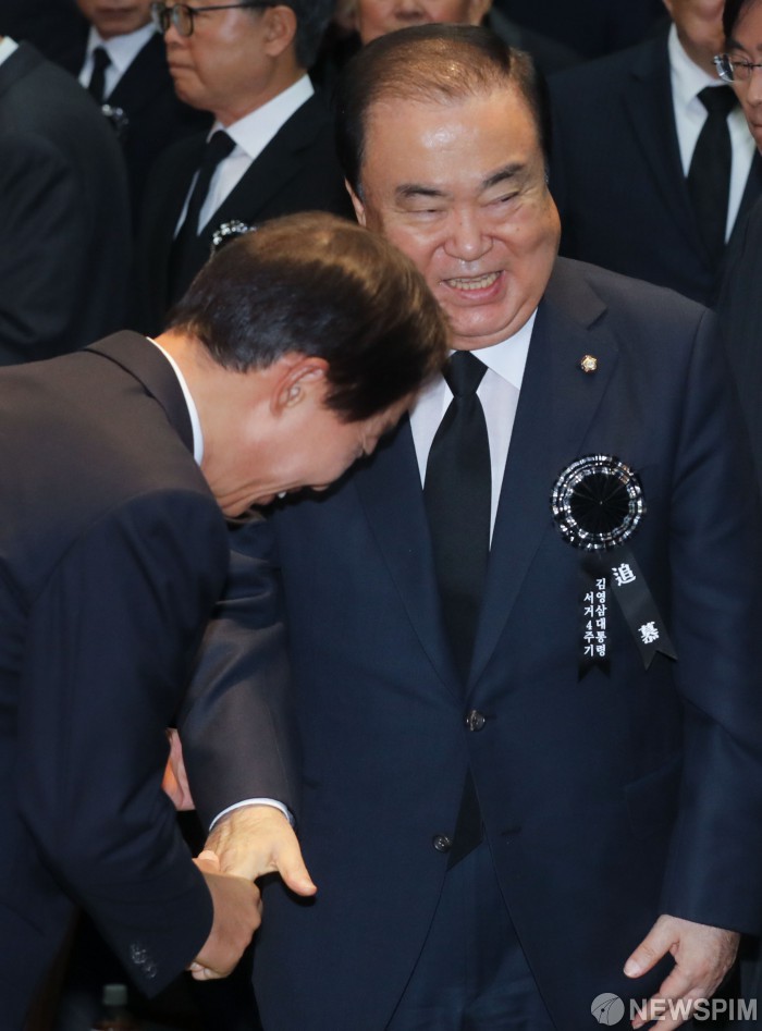 [서울=뉴스핌] 최상수 기자 = 22일 오후 서울 동작구 국립서울현충원에서 열린 고(故) 김영삼 전 대통령 추모식에서 김 전 대통령 아들 김현철 김영삼민주센터 상임이사가 문희상 국회의장과 악수를 나누고 있다. 2019.11.22 kilroy023@newspim.com