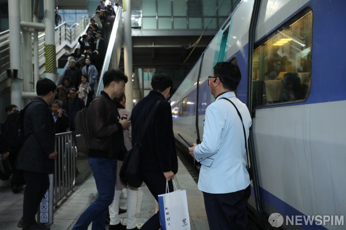 [서울=뉴스핌] 백인혁 기자 = 철도노조 파업 닷새째인 24일 오후 서울 용산구 서울역 KTX 승강장에서 시민들이 KTX에 탑승하고 있다. 2019.11.24 dlsgur9757@newspim.com