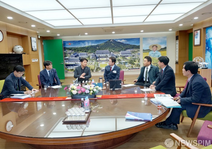 [영덕=뉴스핌] 남효선 기자 = 이희진 경북 영덕군수(가운데 왼쪽)가 25일 경북도청을 방문해 이철우 지사(가운데 오른쪽)와 면담을 갖고 제18호 태풍 '미탁' 피해지역 항구적 복구를 위한 도비 지원을 강력하게 요청하고 있다. 이날 이 군수는 영덕군은 지난해 '콩레이'에 이어 2년 연속 태풍 피해를 입어 재정이 어려움에 처해있음을 설명하고, 태풍 '미탁' 피해복구사업의 원활한 추진을 위해 도비 20억원을 적극 지원해 줄 것을 요청했다.[사진=영덕군] 2019.11.25. nulcheon@newspim.com