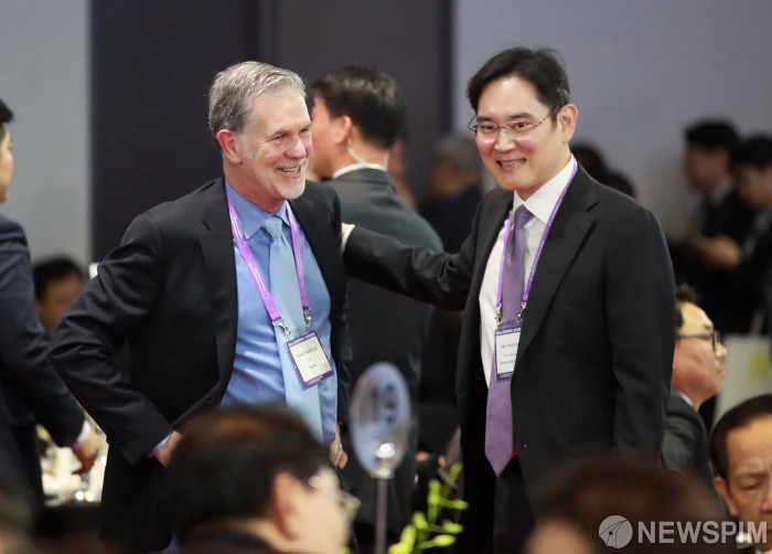 [서울·부산=뉴스핌] 특별취재단 = 이재용 삼성전자 부회장과 리드 헤이스팅스 넷플릭스 CEO가 25일 오후 부산 힐튼호텔에서 열린 2019 한·아세안 특별 정상회의 환영 만찬에서 이야기를 나누고 있다. [사진=2019 한-아세안 특별정상회의 제공] 2019.11.25 photo@newspim.com