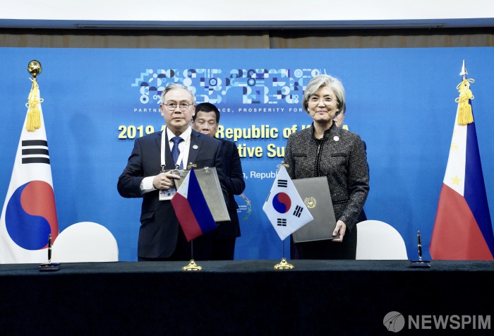 [서울·부산=뉴스핌] 특별취재단 = 강경화 외교부 장관과 록신 필리핀 외교장관이 25일 오후 부산 해운대 조선웨스틴호텔에서 협정서명식을 하고 있다. [사진=2019 한-아세안 특별정상회의 제공] 2019.11.25 photo@newspim.com