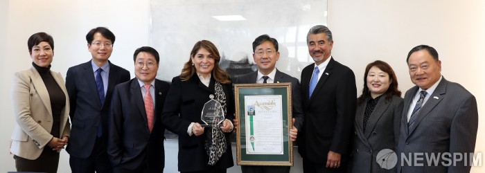 [서울=뉴스핌] 김세혁 기자 = 박양우 문화체육관광부 장관이 26일 서울 국립현대미술관 서울관에서 세런 쿼크 실바 미국 캘리포니아 주 하원의원을 만나 캘리포니아 주 한글날 지정 감사패를 수여하고 기념촬영을 하고 있다. 2019.11.26 starzooboo@newspim.com