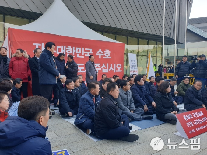 [서울=뉴스핌] 이지현 기자 = 나경원 자유한국당 원내대표 등 한국당 의원들은 27일 국회에서 의원총회를 마친 후 8일째 단식 투쟁중인 황교안 대표가 있는 청와대 사랑채 앞으로 이동했다. 2019.11.27 jhlee@newspim.com