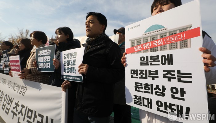 [서울=뉴스핌] 최상수 기자 =강제동원공동행동, 정의기억연대 등 시민사회단체가 27일 오후 서울 여의도 국회 앞에서 강제동원 관련 '문희상 국회의장 안'에 대한 피해자·시민단체 입장 발표 기자회견을 열고 있다. 2019.11.27 kilroy023@newspim.com