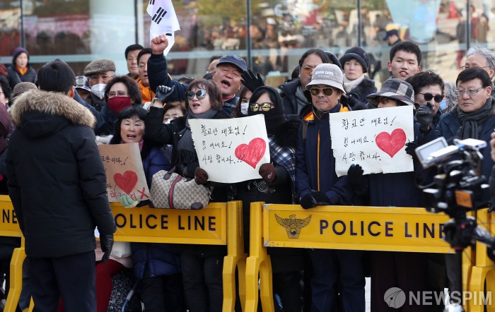 [서울=뉴스핌] 정일구 기자 = 황교안 자유한국당 대표가 8일째 단식을 이어가고 있는 27일 오후 서울 종로구 청와대 앞 분수대광장 천막 앞에서 지지자들이 손팻말을 들고 응원을 하고 있다. 2019.11.27 mironj19@newspim.com