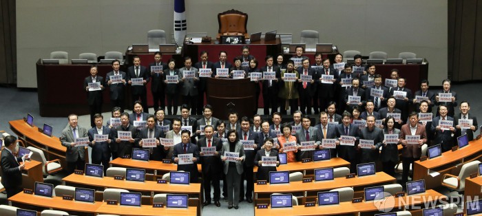 [서울=뉴스핌] 최상수 기자 = 자유한국당 의원들이 29일 오후 서울 여의도 국회 본회의장에서 '민주당과 국회의장 민생외면 국회파탄 규탄대회'를 열고 있다. 2019.11.29 kilroy023@newspim.com