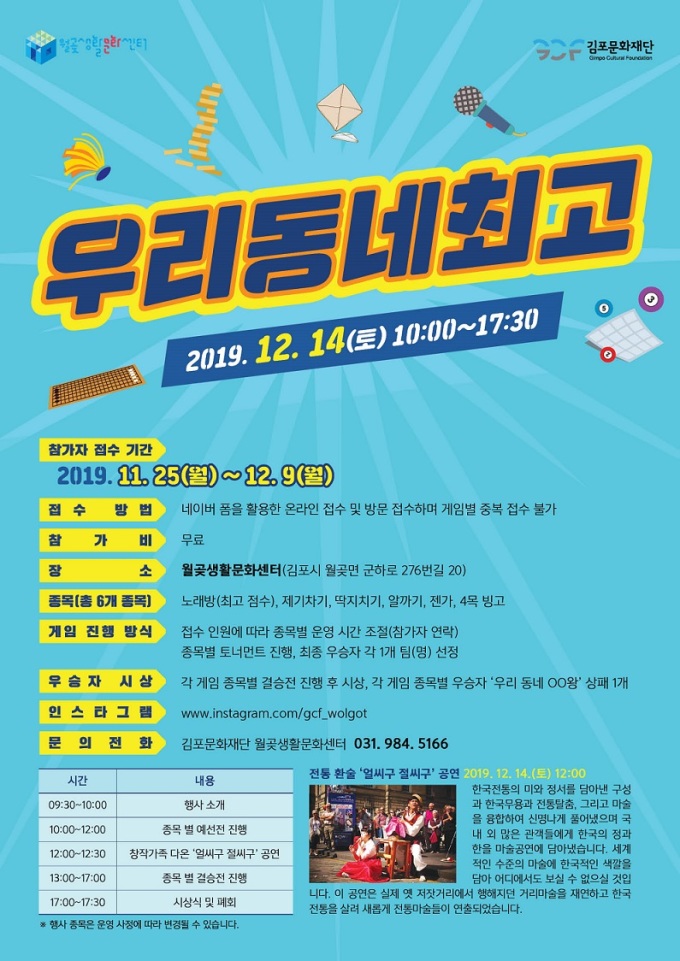 [김포=뉴스핌] 박승봉 기자 = 경기 김포문화재단은 오는 14일 월곶생활문화센터(월곶면사무소)에서 '우리 동네 최고'행사를 개최한다고 2일 밝혔다.