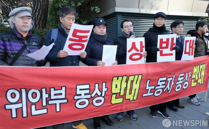 [서울=뉴스핌] 백인혁 기자 = 일본군 성노예제 문제해결을 위한 제1416차 정기 수요시위가 열리고 있는 4일 오후 서울 종로구 옛 일본대사관 앞 평화로 옆에서 이우연 낙성대경제연구소 연구위원을 비롯한 참석자들이 위안부와 노무동원 노동자 동상 설치를 반대 기자회견을 열고 발언하고 있다. 2019.12.04 dlsgur9757@newspim.com