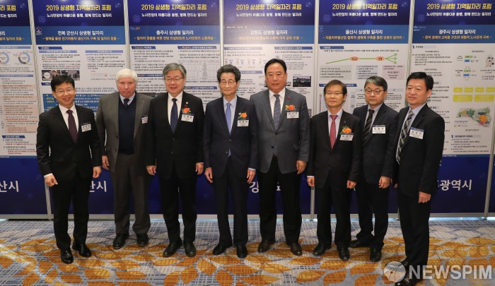 [서울=뉴스핌] 최상수 기자 = 이목희 일자리위원회 부위원장(왼쪽 네번째), 이재갑 고용노동부 장관(왼쪽 세번째)을 비롯한 참석자들이 6일 오전 서울 포시즌스호텔에서 열린 2019 상생형 지역일자리 포럼에서 기념촬영을 하고 있다. 2019.12.06 kilroy023@newspim.com