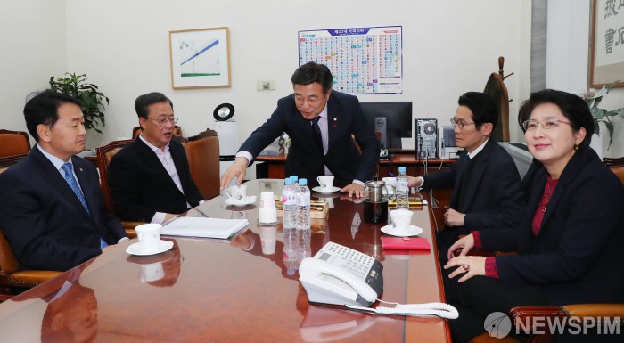 [서울=뉴스핌] 이형석 기자 = 김관영(왼쪽 부터) 바른미래당 의원, 유성엽 대안신당 창당준비위원장, 윤호중 더불어민주당 사무총장, 윤소하 정의당 원내대표, 박주현 민주평화당 의원이 9일 오전 서울 여의도 국회에서 열린 여야 4+1 선거법 협의체 회의에 참석해 대화를 나누고 있다. 2019.12.09 leehs@newspim.com