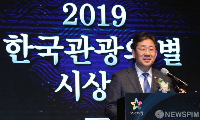 [서울=뉴스핌] 김세혁 기자 = 박양우 문화체육관광부 장관이 10일 서울 중구 신라호텔에서 열린 ‘2019 한국관광의별 시상식’에 참석해 축사를 하고 있다. [사진=문체부] 2019.12.10 starzooboo@newspim.com