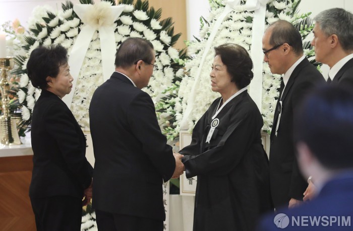[수원=뉴스핌] 백인혁 기자 = 이종찬 전 국정원장이 10일 오후 경기 수원시 아주대학교병원 장례식장에 마련된 故 김우중 전 대우그룹 회장의 빈소를 찾아 김 전 회장 부인인 정희자 전 힐튼호텔 회장을 위로하고 있다. 2019.12.10 dlsgur9757@newspim.com