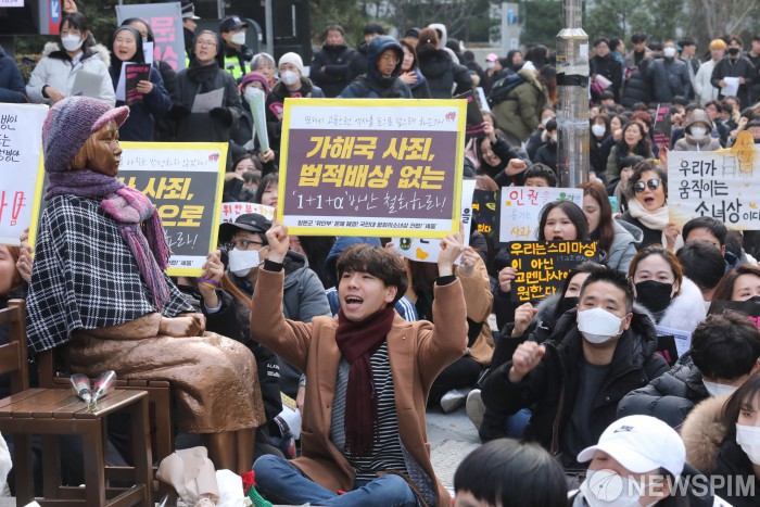 [서울=뉴스핌] 백인혁 기자 = 제1417차 일본군성노예제 문제해결을 위한 정기 수요시위가 열린 11일 오후 서울 종로구 옛 일본대사관 앞에서 참가자들이 일본의 사죄를 촉구하는 구호를 외치고 있다. 2019.12.11 dlsgur9757@newspim.com