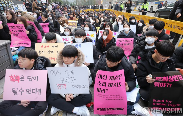 [서울=뉴스핌] 백인혁 기자 = 제1417차 일본군성노예제 문제해결을 위한 정기 수요시위가 열린 11일 오후 서울 종로구 옛 일본대사관 앞에서 참가자들이 일본의 사죄를 촉구하는 피켓을 들고 있다. 2019.12.11 dlsgur9757@newspim.com