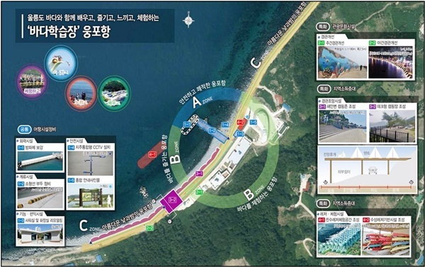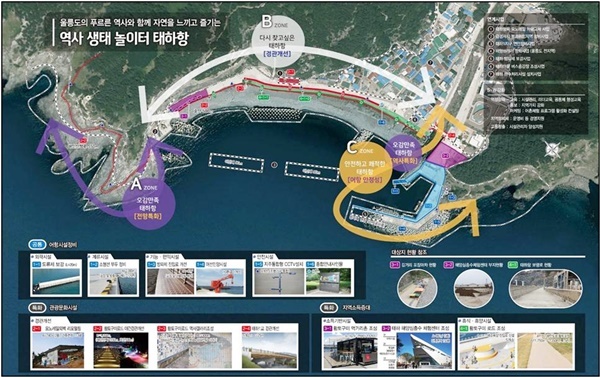 울릉군 관계자는 "태하항은 '역사 생태 놀이터'를 비젼으로 98억원을 들여 해양심층수 체험센터 건설, 어항시설 정비, 황토구미 로드조성 등이 들어설 예정이며 100억원의 사업비가 들어갈 웅포항은 '울릉도 바다와 함께 배우고, 즐기고, 느끼고, 체험하는 바다학습장'을 비젼으로 정하고 친수레저 해양체험공간 조성, 어항시설 정비, 경관개선사업 등이 추진된다"고 밝혔다