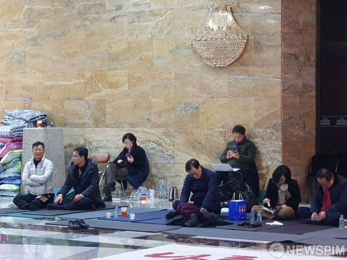 [서울=뉴스핌] 이지현 기자 = 자유한국당 의원들이 16일 본회의장 앞 무기한 농성장에 모여있다. 2019.12.16 jhlee@newspim.com
