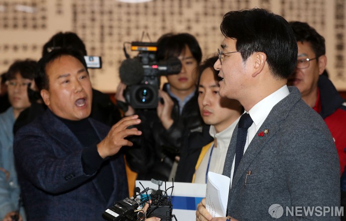 [서울=뉴스핌] 정일구 기자 = 박용진 더불어민주당 의원이 16일 오전 서울 여의도 국회 로텐더홀에서 유치원 3법의 신속한 처리 협조와 필리버스터 철회를 요청하는 기자회견을 하는 가운데 자유한국당 관계자들의 항의를 받고 있다. 2019.12.16 mironj19@newspim.com