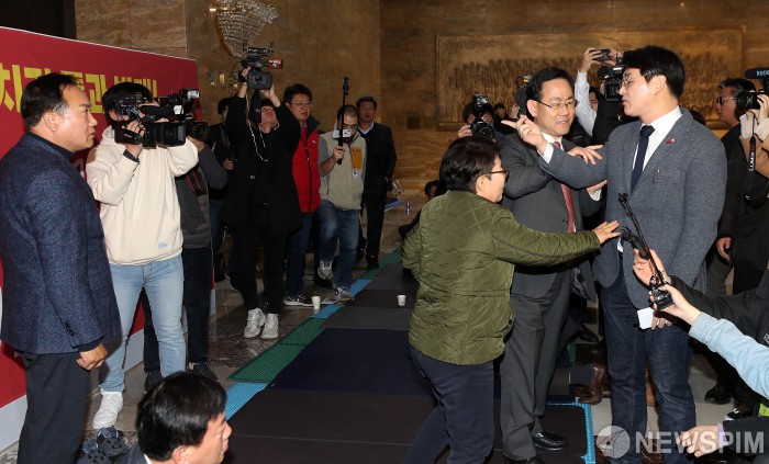 [서울=뉴스핌] 정일구 기자 = 박용진 더불어민주당 의원이 16일 오전 서울 여의도 국회 로텐더홀에서 유치원 3법의 신속한 처리 협조와 필리버스터 철회를 요청하는 기자회견을 마치고 자유한국당 관계자들과 언쟁을 벌이고 있다. 2019.12.16 mironj19@newspim.com