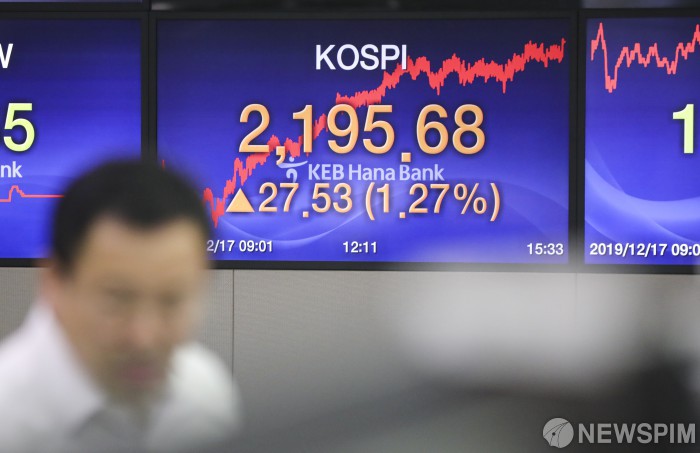 [서울=뉴스핌] 이한결 기자 = 외국민 매수세로 코스피가 1% 이상 급등한 17일 오후 서울 중구 KEB하나은행 딜링룸에서 딜러들이 업무를 보고 있다. 이날 코스피 지수는 전 거래일보다 27.53포인트(1.27%) 오른 2,195.68을 기록했고, 코스닥 지수는 전일 대비 6.14포인트(0.95%) 오른 650.58, 달러/원 환율은 6.1원 내린 1,166.2원에 장을 마쳤다. 2019.12.17 alwaysame@newspim.com
