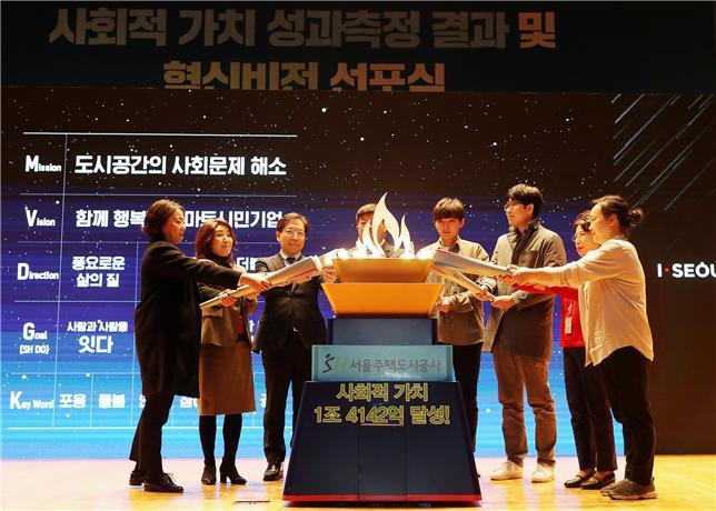 서울주택도시공사는 2018년도 SH공사의 사회적 가치를 측정한 결과 1조4141.5억원임을 선포했다. 아울러 향후 도시공간의 사회문제 해소를 위한'함께 행복한 스마트 시민기업'이라는 새로운 사회적 가치 혁신비전으로 거듭날 것을 대내외에 선포했다.