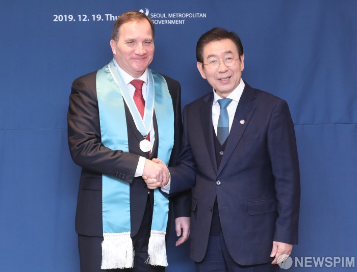 [서울=뉴스핌] 백인혁 기자 = 박원순 서울시장(오른쪽)이 19일 오전 서울 중구 서울시청 시장실에서 열린 스웨덴 총리 명예시민증 수여식에서 스테판 뢰벤 스웨덴 총리에게 명예시민증 수여 후 기념촬영을 하고 있다. 2019.12.19 dlsgur9757@newspim.com