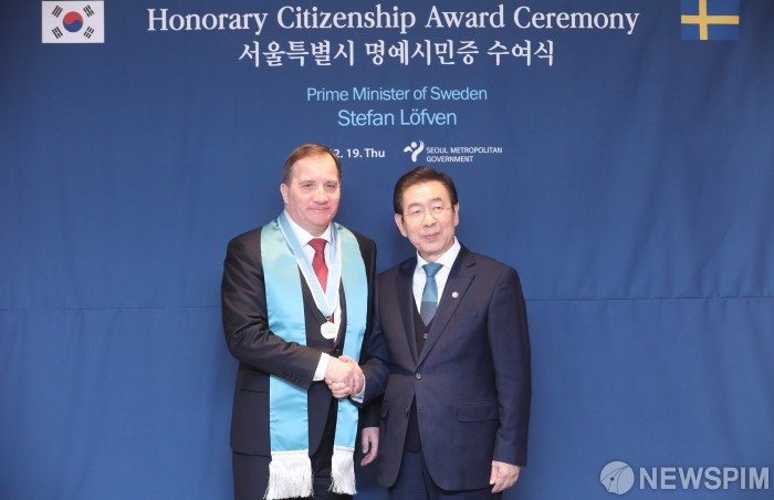[서울=뉴스핌] 백인혁 기자 = 박원순 서울시장(오른쪽)이 19일 오전 서울 중구 서울시청 시장실에서 열린 스웨덴 총리 명예시민증 수여식에서 스테판 뢰벤 스웨덴 총리에게 명예시민증 수여 후 기념촬영을 하고 있다. 2019.12.19 dlsgur9757@newspim.com