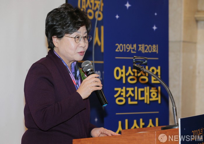 [서울=뉴스핌] 윤창빈 기자 = 정윤숙 여성기업종합지원센터 이사장이 19일 오후 서울 여의도 켄싱턴호텔에서 열린 제20회 여성창업경진대회 시상식에서 인사말을 하고 있다. 2019.12.19 pangbin@newspim.com