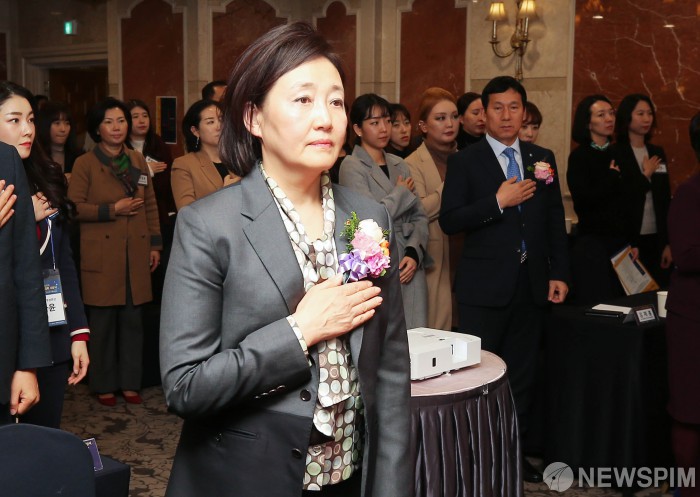 [서울=뉴스핌] 윤창빈 기자 = 박영선 중소벤처기업부 장관과 참석자들이 19일 오후 서울 여의도 켄싱턴호텔에서 열린 제20회 여성창업경진대회 시상식에서 국민의례를 하고 있다. 2019.12.19 pangbin@newspim.com