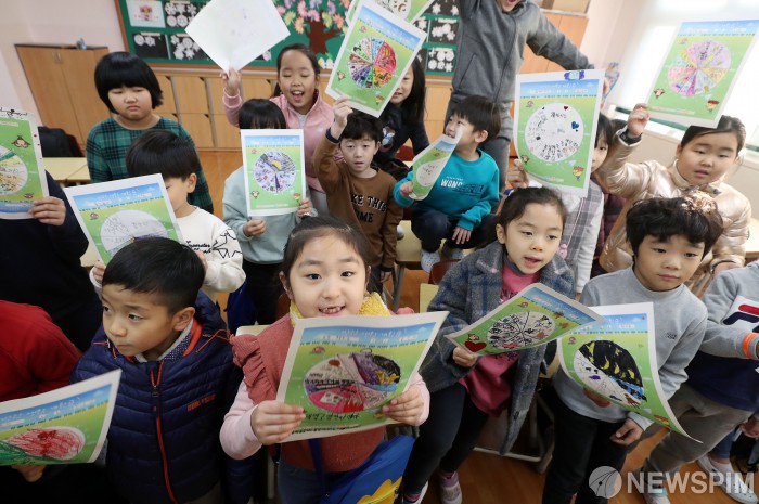 [서울=뉴스핌] 정일구 기자 = 20일 오전 서울 중랑구 묵현초등학교에서 방학을 맞은 1학년 학생들이 방학 생활 계획표를 들고 환하게 웃고 있다. 2019.12.20 mironj19@newspim.com