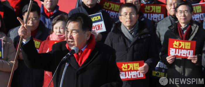 [서울=뉴스핌] 최상수 기자 = 심재철 자유한국당 원내대표가 20일 오후 서울 여의도 국회 앞에서 열린 공수처법·선거법 날치기 저지 규탄대회에서 모두발언을 하고 있다. 2019.12.20 kilroy023@newspim.com