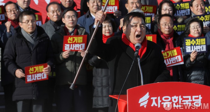 [서울=뉴스핌] 최상수 기자 = 심재철 자유한국당 원내대표가 20일 오후 서울 여의도 국회 앞에서 열린 공수처법·선거법 날치기 저지 규탄대회에서 모두발언을 하고 있다. 2019.12.20 kilroy023@newspim.com