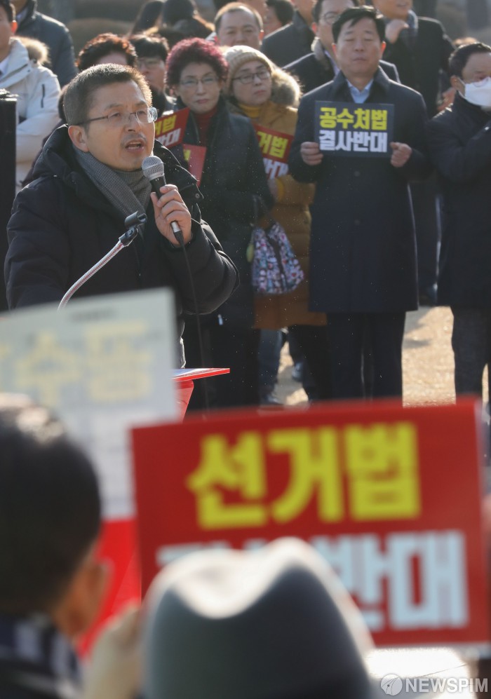 [서울=뉴스핌] 최상수 기자 = 황교안 자유한국당 대표가 20일 오후 서울 여의도 국회 앞에서 열린 공수처법·선거법 날치기 저지 규탄대회에서 모두발언을 하고 있다. 2019.12.20 kilroy023@newspim.com