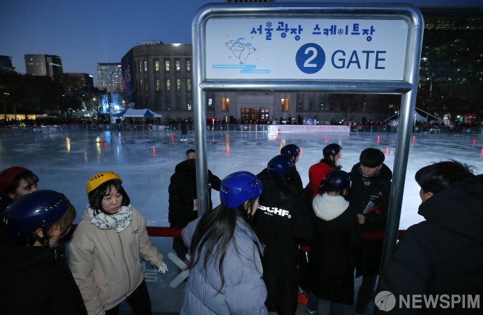 [서울=뉴스핌] 윤창빈 기자 = 20일 오후 서울 중구 서울광장에 마련된 스케이트장에서 시민들이 입장하고 있다. 서울광장 스케이트장은 내년 2월 9일까지 운영되며, 평일엔 오전 10시부터 밤 9시 반, 주말엔 밤 11시까지 운영된다. 입장료는 스케이트 대여료를 포함해 1천 원이며 제로페이로 결제시 30% 할인 된다. 2019.12.20 pangbin@newspim.com