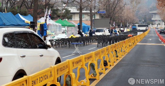 [서울=뉴스핌] 이형석 기자 = 서울시가 오늘(22일)까지 청와대 앞에서 노숙 농성을 벌이고 있는 문재인하야범국민투쟁본부에 도로 위 시설물을 철거하라는 계고장을 전달했다. 계고장을 받은 의무자의 이행기간은 통상 해가 지기 전까지다. 이날 청와대 인근 도로에 의자와 천막을 비롯한 시설물이 설치되어 있다. 2019.12.22 leehs@newspim.com