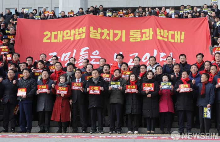 [서울=뉴스핌] 최상수 기자 =황교안 자유한국당 대표를 비롯한 참석자들이 23일 오후 서울 여의도 국회에서 열린 공수처법·선거법 날치기 저지 규탄대회에서 구호를 외치고 있다. 2019.12.23 kilroy023@newspim.com