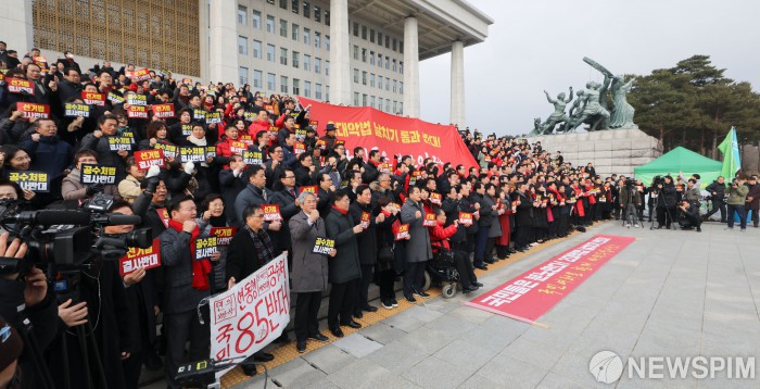 [서울=뉴스핌] 최상수 기자 =황교안 자유한국당 대표를 비롯한 참석자들이 23일 오후 서울 여의도 국회에서 열린 공수처법·선거법 날치기 저지 규탄대회에서 구호를 외치고 있다. 2019.12.23 kilroy023@newspim.com