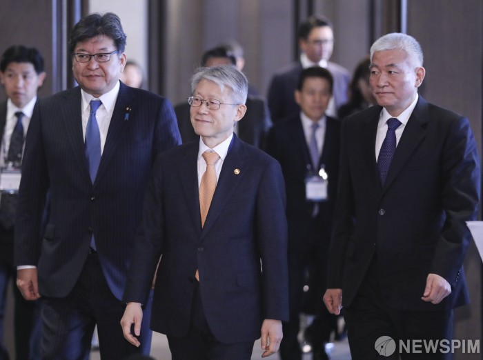 [서울=뉴스핌] 이한결 기자 = 하기우다 고이치 일본 문부과학성 대신(왼쪽부터), 최기영 과학기술정보통신부 장관, 왕즈강 중국 과학기술부 부장이 26일 오전 서울 중구 더 플라자 호텔에서 열린 ‘제4차 한·중·일 과학기술장관회의’에 입장하고 있다. 2019.12.26 alwaysame@newspim.com