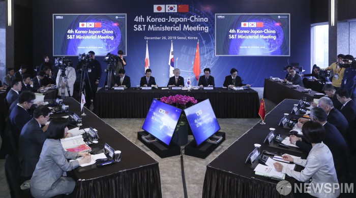 [서울=뉴스핌] 이한결 기자 = 26일 오전 서울 중구 더 플라자 호텔에서 ‘제4차 한·중·일 과학기술장관회의’가 열리고 있다. 이날 회의에는 최기영 과학기술정보통신부 장관, 하기우다 고이치 일본 문부과학성 대신, 왕즈강 중국 과학기술부 부장이 참석했다. 2019.12.26 alwaysame@newspim.com