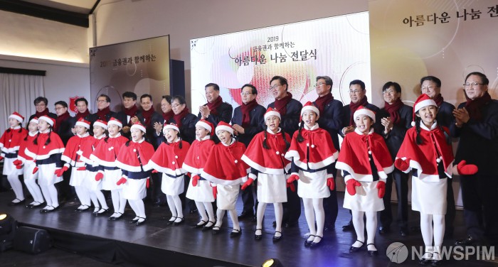 [서울=뉴스핌] 이한결 기자 = 26일 오전 서울 종로구 구세군 중앙회관에서 열린 ‘2019 금융권과 함께하는 아름다운 나눔 전달식’에서 금융권 기금 전달식을 마친 뒤 역사어린이합창단과 참석자들이 캐롤 메들리를 합창하고 있다. 이날 행사에는 김필수 구세군 한국군국 사령관, 윤석헌 금융감독원 원장, 이대훈 NH농협은행장, 진옥동 신한은행장, 손태승 우리은행장, 이동빈 SH수협은행장, 지성규 KEB하나은행장 등 금융권 관계자들이 참석했다. 2019.12.26 alwaysame@newspim.com