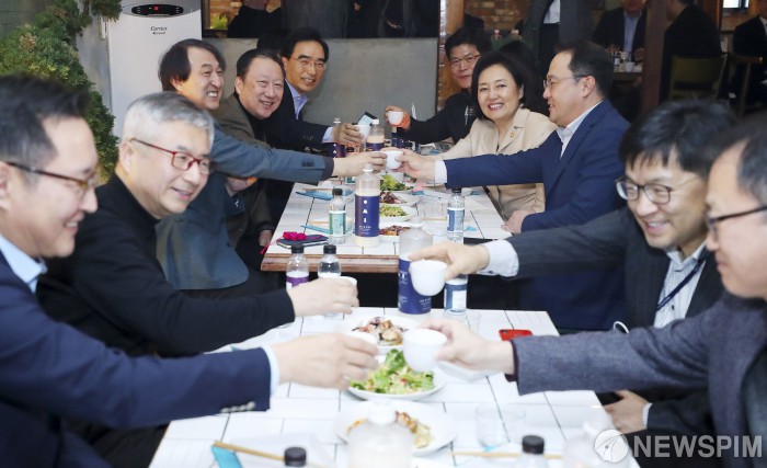 [서울=뉴스핌] 이한결 기자 = 박용만 대한상공회의소 회장과 박영선 중소벤처기업부 장관이 26일 오후 서울 종로구 익선동의 한 음식점에서 열린 강소기업 100 막걸리 만찬 간담회에 참석해 기업 대표들과 건배하고 있다. 2019.12.26 alwaysame@newspim.com