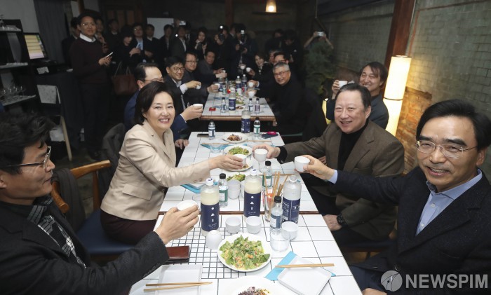 [서울=뉴스핌] 이한결 기자 = 박용만 대한상공회의소 회장과 박영선 중소벤처기업부 장관이 26일 오후 서울 종로구 익선동의 한 음식점에서 열린 강소기업 100 만찬 간담회에 참석해 기업 대표들과 건배하고 있다. 2019.12.26 alwaysame@newspim.com