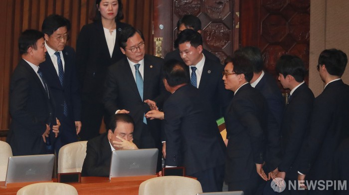 [서울=뉴스핌] 이형석 기자 = 27일 오후 서울 여의도 국회에서 의장석에 오르지 못한 문희상 국회의장이 자리에 앉아 있다. 이날 자유한국당 의원들이 선거법 개정안 표결을 막기 위해 국회 의장석 통로를 점거했다. 2019.12.27 leehs@newspim.com