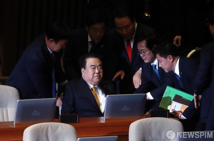 [서울=뉴스핌] 이형석 기자 = 27일 오후 서울 여의도 국회에서 의장석에 오르지 못한 문희상 국회의장이 자리에 앉아 있다. 이날 자유한국당 의원들이 선거법 개정안 표결을 막기 위해 국회 의장석 통로를 점거했다. 2019.12.27 leehs@newspim.com