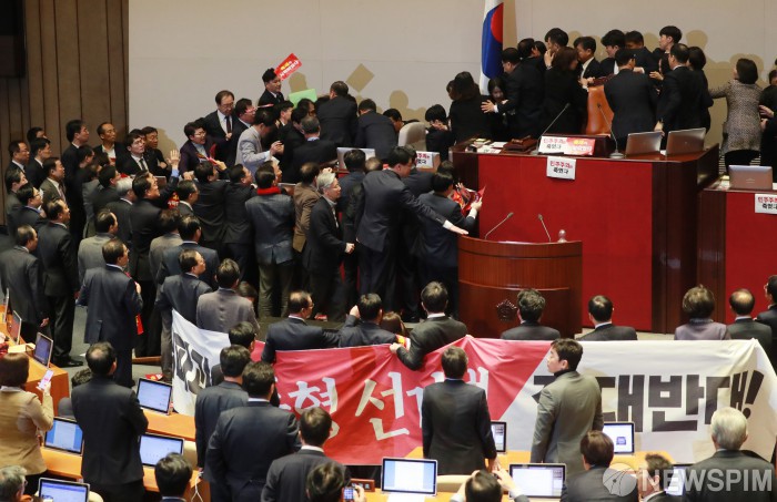 [서울=뉴스핌] 이형석 기자 = 문희상 국회의장이 27일 오후 서울 여의도 국회에서 예정되어 있는 본회의에 참석하려 하자 자유한국당 의원이 막아서고 있다. 2019.12.27 leehs@newspim.com