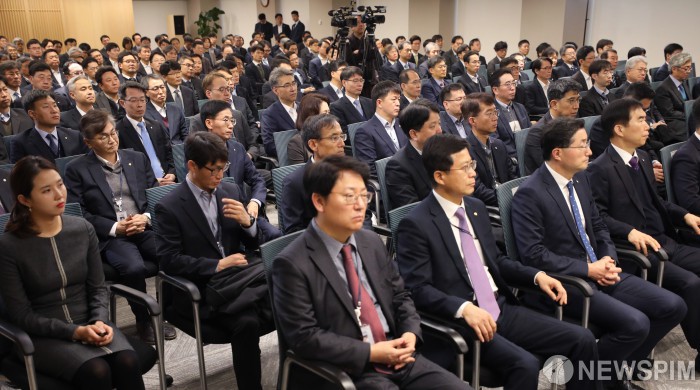 [서울=뉴스핌] 백인혁 기자 = 한국은행 임직원들이 2일 오전 서울 중구 삼성본관빌딩 한국은행에서 열린 2020 한국은행 시무식에서 이주열 한국은행 총재의 신년사를 경청하고 있다 . 2020.01.02 dlsgur9757@newspim.com