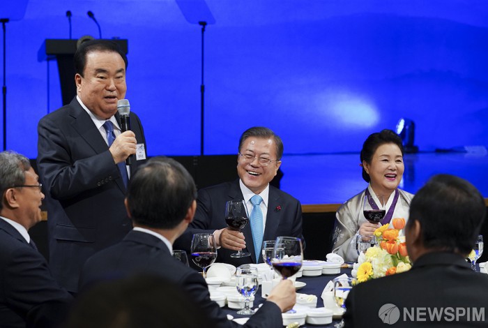 [서울=뉴스핌] 문재인 대통령이 2일 서울 중구 대한상공회의소에서 열린 정부 신년합동인사회에서 문희상 국회의장의 건배사를 듣고 있다.[사진=청와대] 2020.01.02.photo@newspim.com