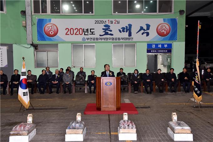 [부산=뉴스핌] 남경문 기자 = 부산시는 2일 경자년 새해 첫 경매를 기념해 부산공동어시장에서 출어선 안전과 만선을 기원하는 초매식을 개최했다.