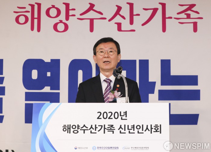 [서울=뉴스핌] 이한결 기자 = 문성혁 해양수산부 장관이 6일 오전 서울 종로구 세종문화회관 세종홀에서 열린 ‘2020년 해양수산가족 신년인사회’에서 인사말을 하고 있다. 2020.01.06 alwaysame@newspim.com